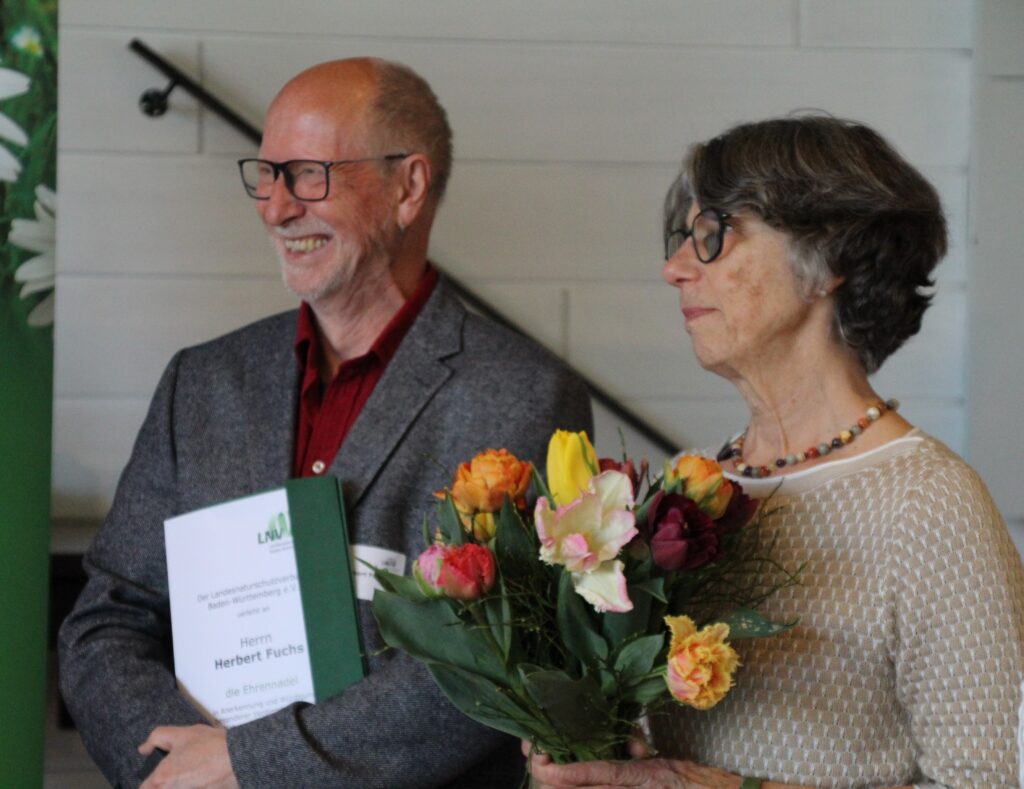 Herbert Fuchs zählte 1980 zu den Gründungsmitgliedern des LNV-AK im Zollernalbkreis. Unter seiner Federführung entstand 1993 das gemeinsame Naturschutzbüro Zollernalb von LNV-AK, den Kreisverbänden von BUND, NABU und von weiteren Verbänden. 30 Jahre, bis zur Auflösung des Naturschutzbüros 2023 stand Fuchs als ehrenamtlicher Geschäftsführer im Zentrum des Geschehens. Kaum bezifferbar ist der Zeitaufwand. Waren es 200 Stunden pro Jahr über die 30 Jahre? Oder doch wesentlich mehr? Und doch blieb noch Zeit für den Schmetterlingsschutz und vieles andere mehr. LNV-Vorsitzender Dr. Gerhard Bronner zeichnete Herbert Fuchs bei der LNV-MV am 12.04.2025 mit der LNV-Ehrennadel aus. LNV-PM vom 16.04.2025