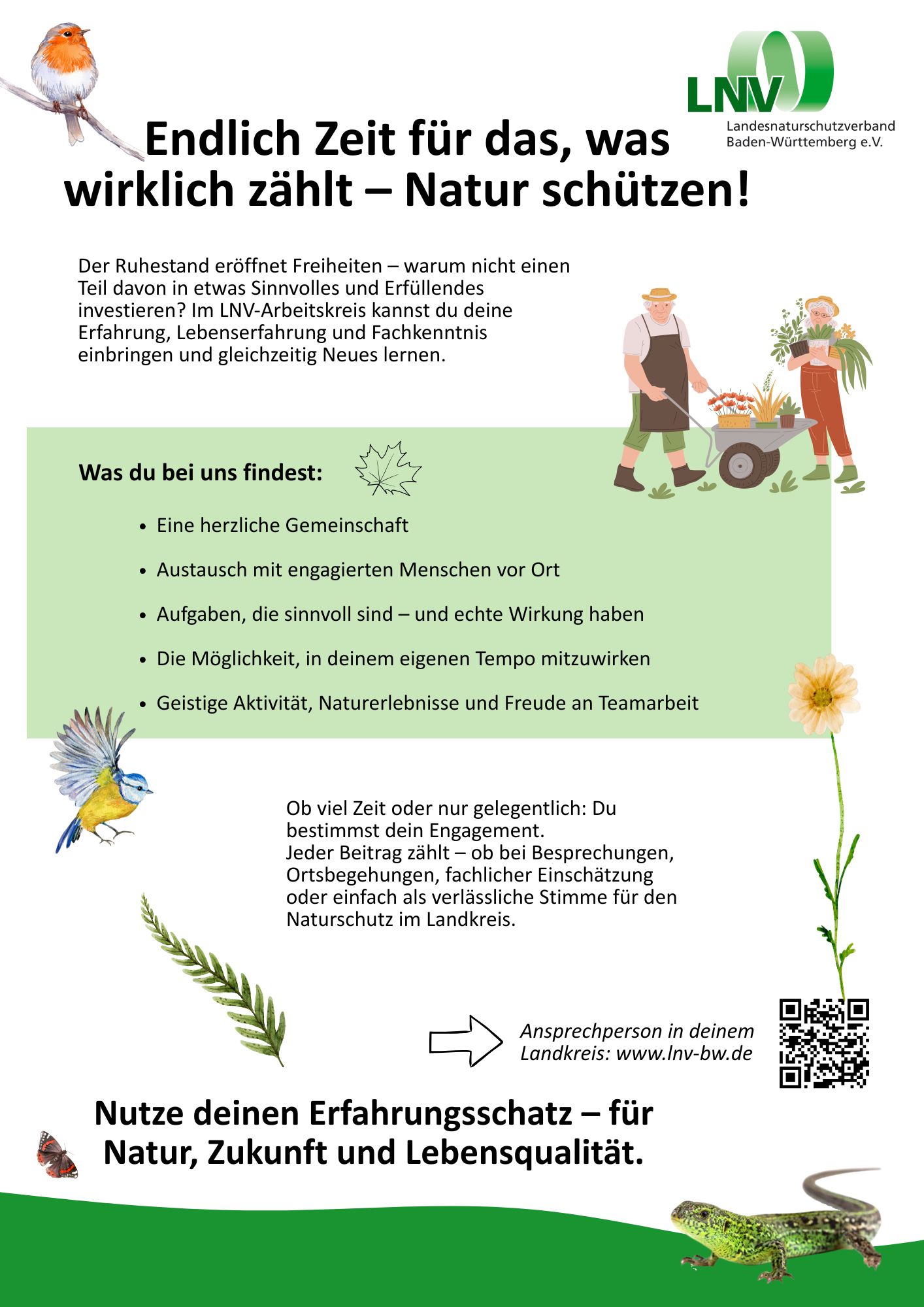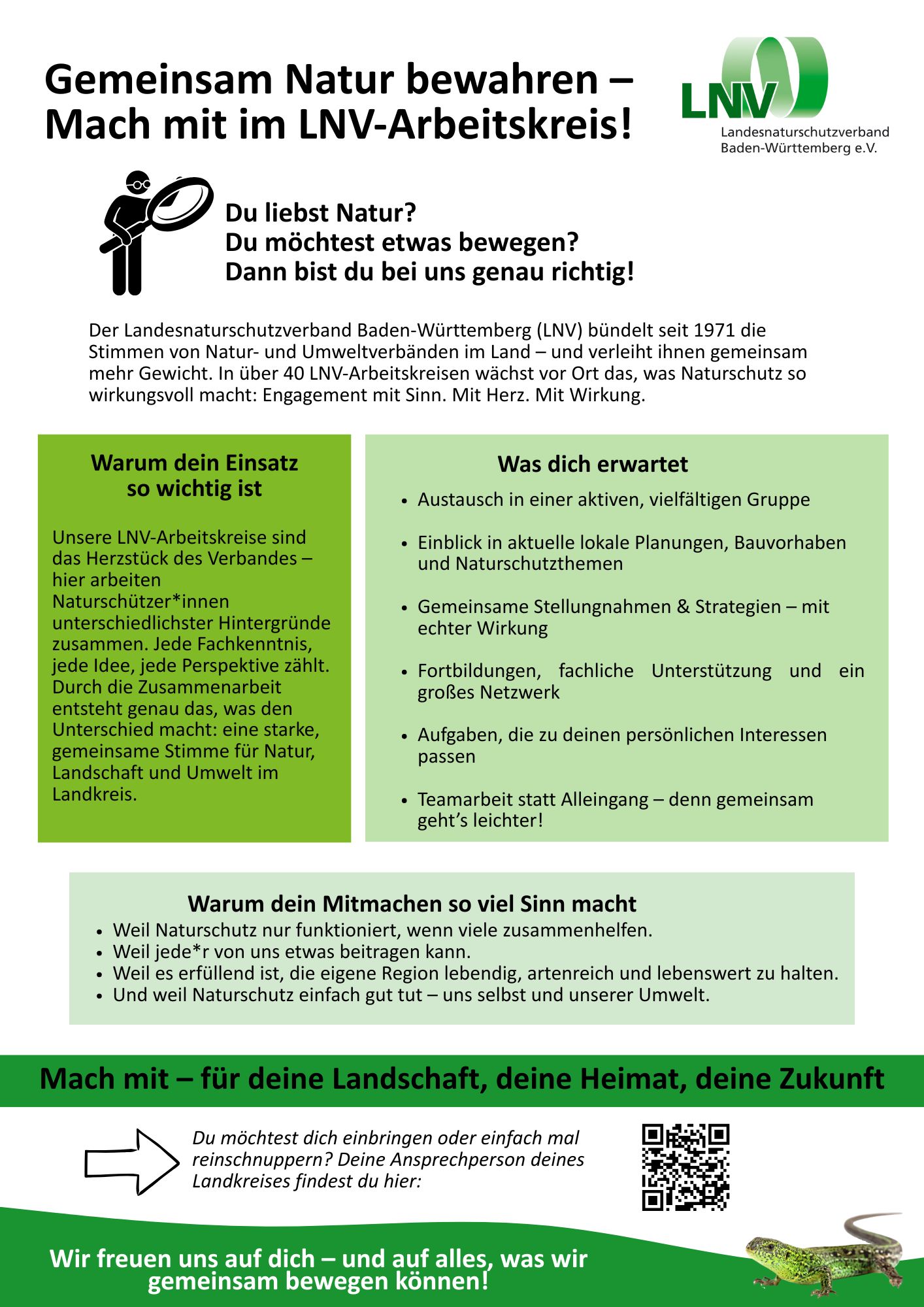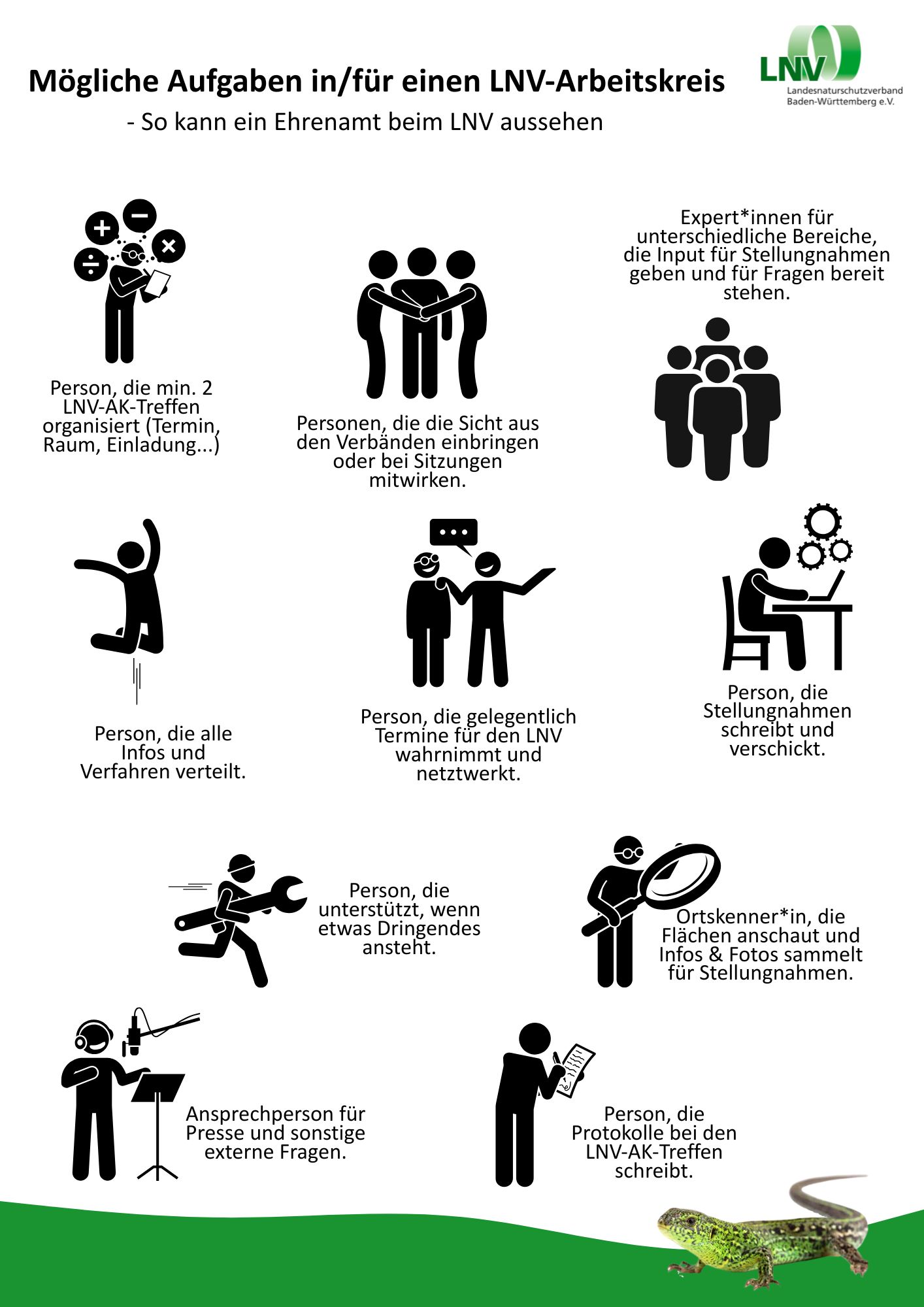 LNV-Plakate zum Ausdrucken Hier finden Sie Plakate zum Ausdrucken und Aufhängen rund um den LNV und für die Mitgliedersuche für Ihren LNV-Arbeitskreis. LNV-Info-PlakatHerunterladen Plakat Tag der Artenvielfalt 2026Herunterladen Plakat Stein – VeranstaltungenHerunterladen Plakat für LNV-AK-InteressierteHerunterladen Mögliche Aufgaben im LNV-ArbeitskreisHerunterladen Komm in den LNV-Arbeitskreis – Zielgruppe junge Menschen z.B. StudierendeHerunterladen Komm in den LNV-Arbeitskreis – Zielgruppe ElternHerunterladen Komm in den LNV-Arbeitskreis – Zielgruppe RenteHerunterladen Komm in den LNV-Arbeitskreis – Zielgruppe Art-ExpertenHerunterladen Plakat LNV-StiftungHerunterladen Infoflyer für LNV-AK-InteressierteHerunterladen